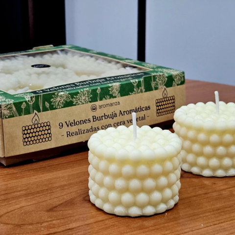Velón aromático de cera vegetal con diseño de burbujas. Decora, perfuma suavemente y suma una luz cálida ideal para crear un clima tranquilo y cuidado.