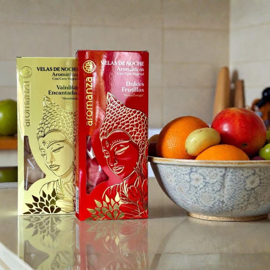 Velas de noche aromáticas hechas con cera vegetal. Ideales para hornillos, porta velas y momentos de relax. Buena fragancia, duración pareja y excelente relación calidad/precio.