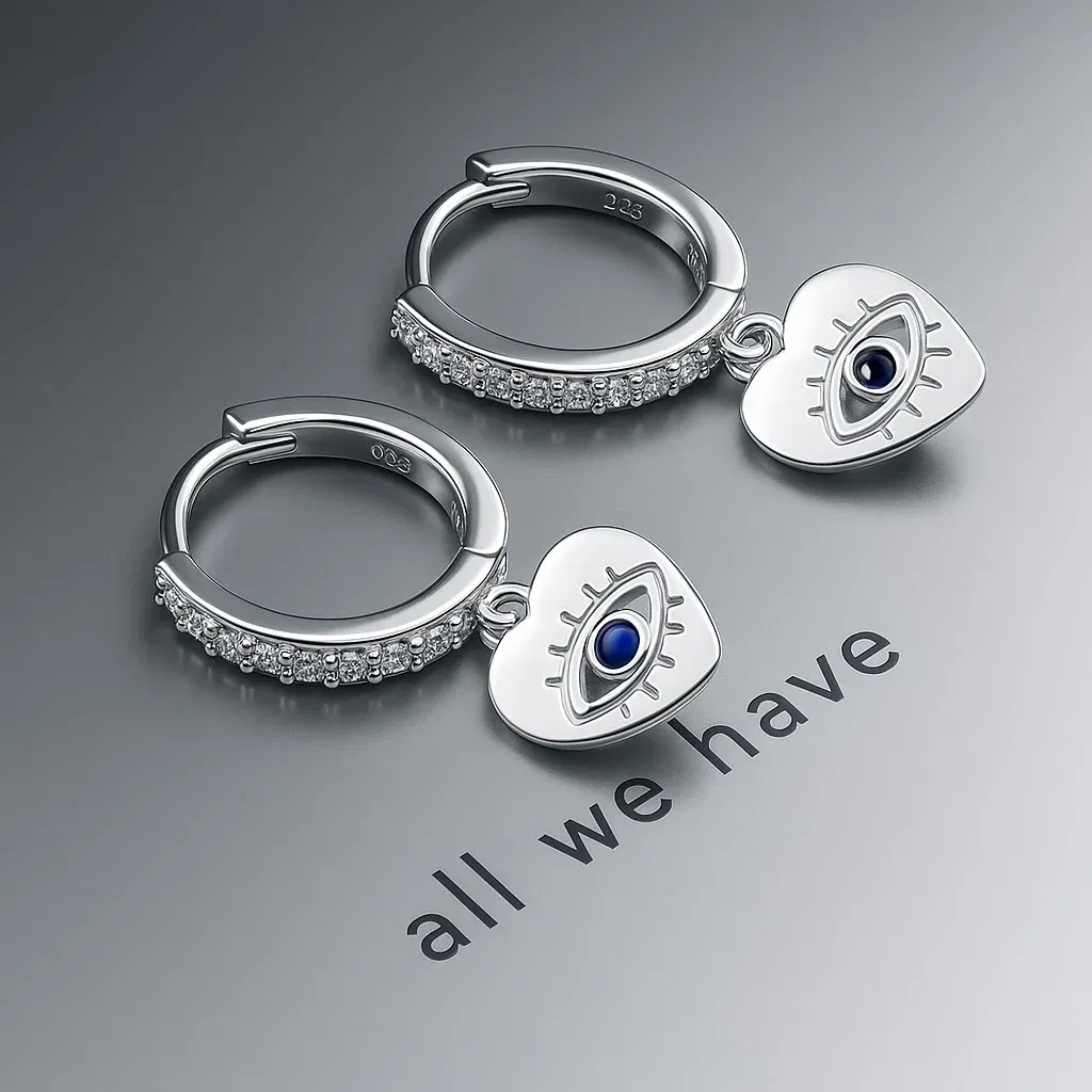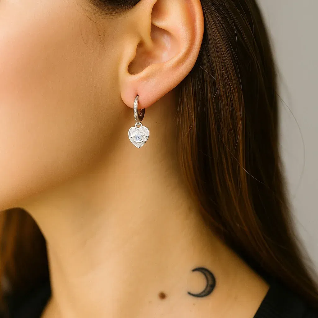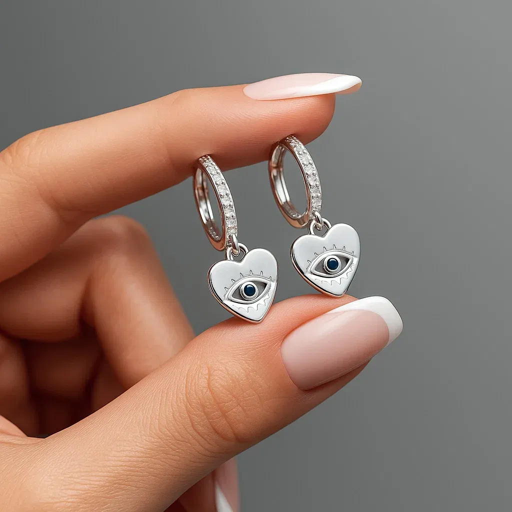 Las Argollas de Plata 925 de 12 mm con dije de Corazón y Ojito Turco son una de las piezas de joyería más buscadas actualmente, ya que combinan el simbolismo de protección del ojo turco con el diseño romántico del corazón.