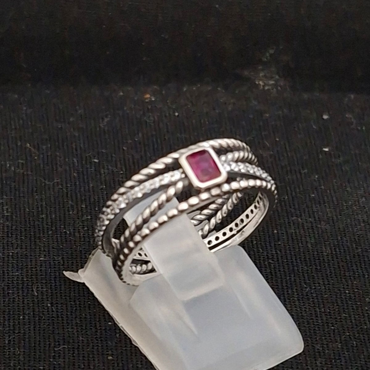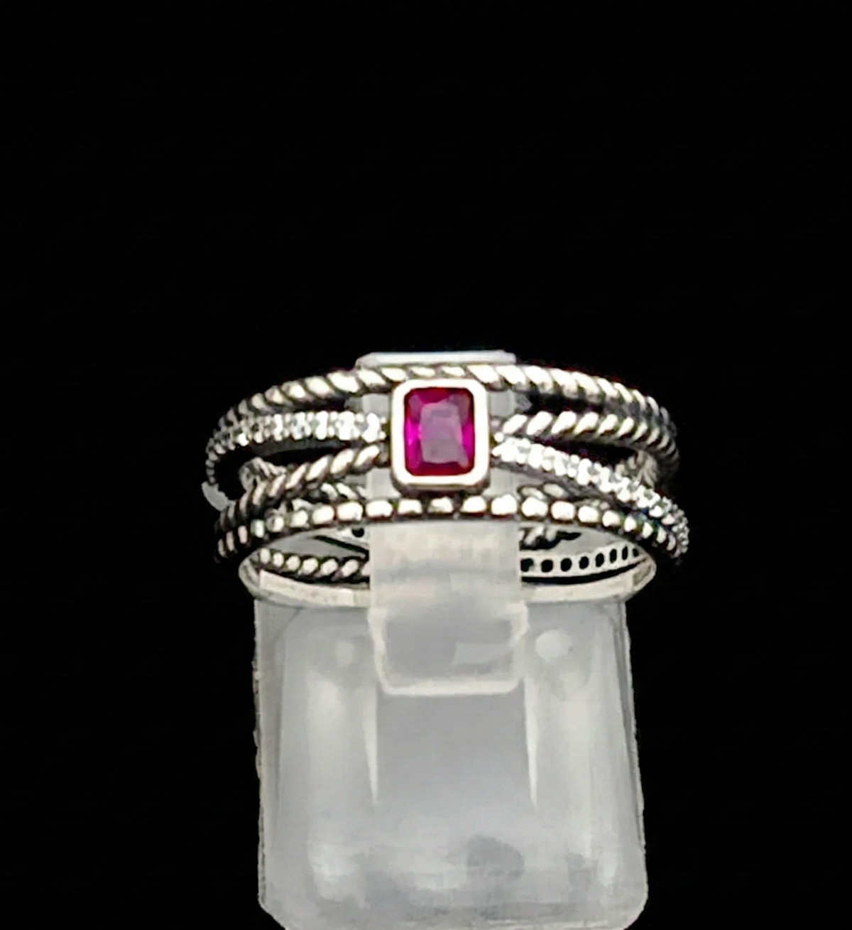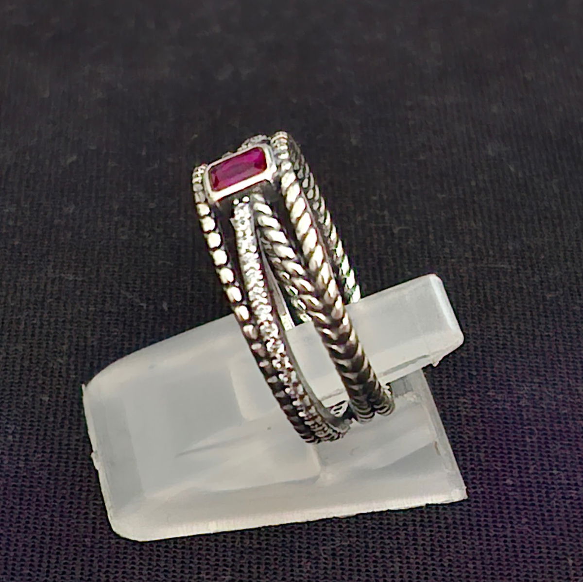 Su diseño de triple banda en plata con detalles tipo pavé enmarca una piedra central color rubí, logrando un equilibrio perfecto entre carácter, brillo y elegancia.