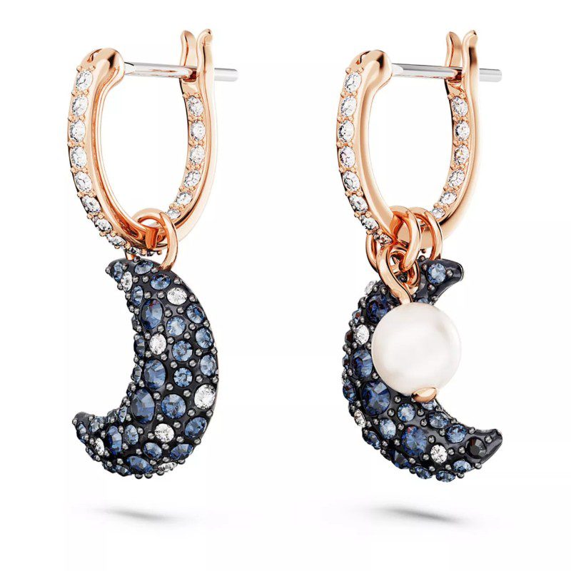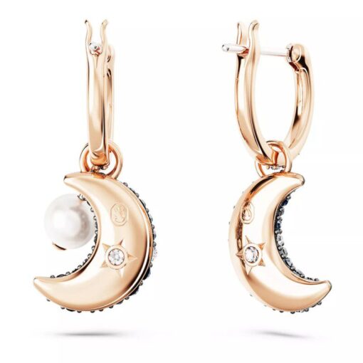 Las medias lunas, trabajadas con pavé de cristales en tonos oscuros, cuelgan de miniaros brillantes y se completan con una perla desmontable, lo que permite usarlos de distintas maneras según el momento.