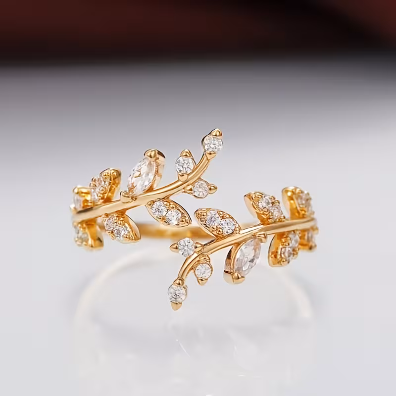 ¡Qué buena elección! Los anillos con motivos botánicos y de hojas son tendencia porque combinan un aire natural con mucha elegancia. Al añadirles circones, se transforman en piezas que captan la luz de una forma espectacular.