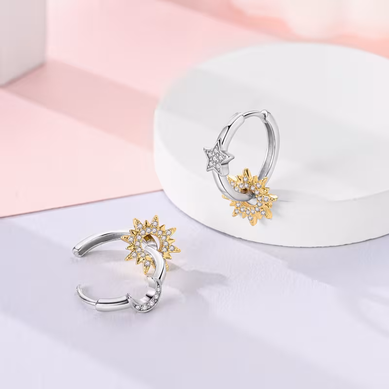 Estos aros asimétricos de Sol y Luna representan una de las tendencias más fuertes en joyería contemporánea: el concepto de la "dualidad" o el equilibrio cósmico. Al estar rodinados, cuentan con un acabado de alta gama que no solo les da un brillo similar al oro blanco o platino, sino que también protege la pieza de la oxidación.