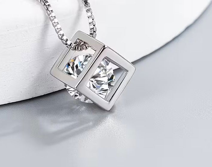 Una pieza moderna y sofisticada que juega con la geometría y el brillo justo. Este collar de plata rodinada presenta un dije en forma de cubo, con un cristal suspendido en su interior que refleja la luz desde todos los ángulos. Minimalista, elegante y con presencia: de esos collares que se notan sin necesidad de exagerar.