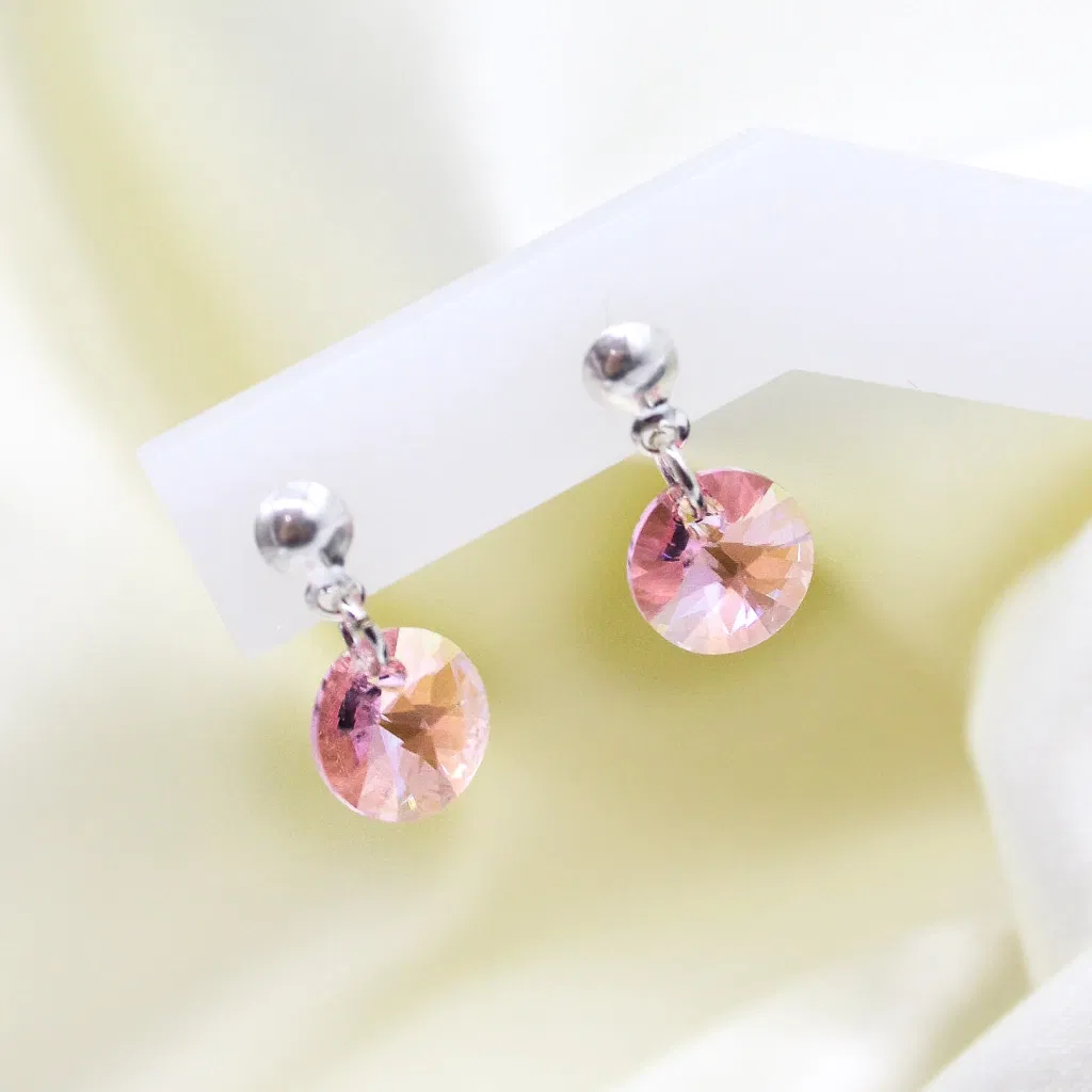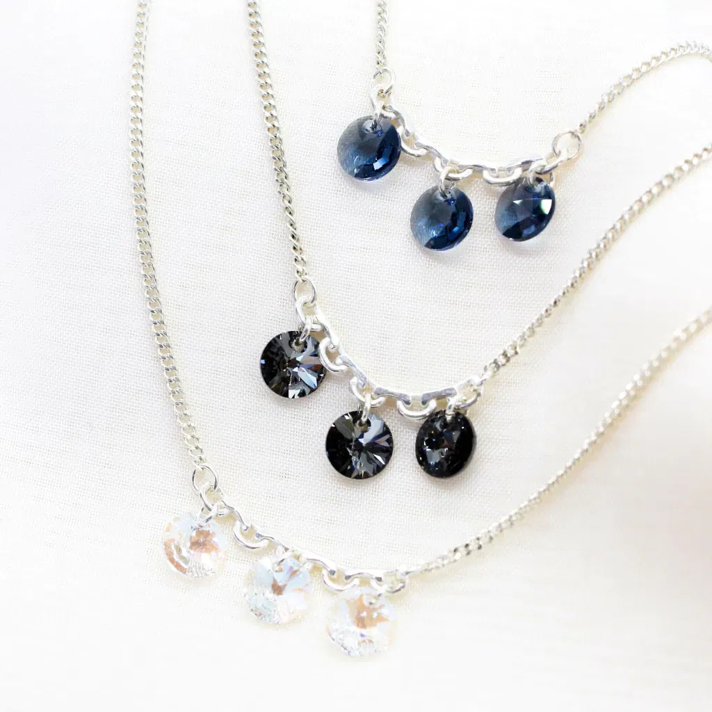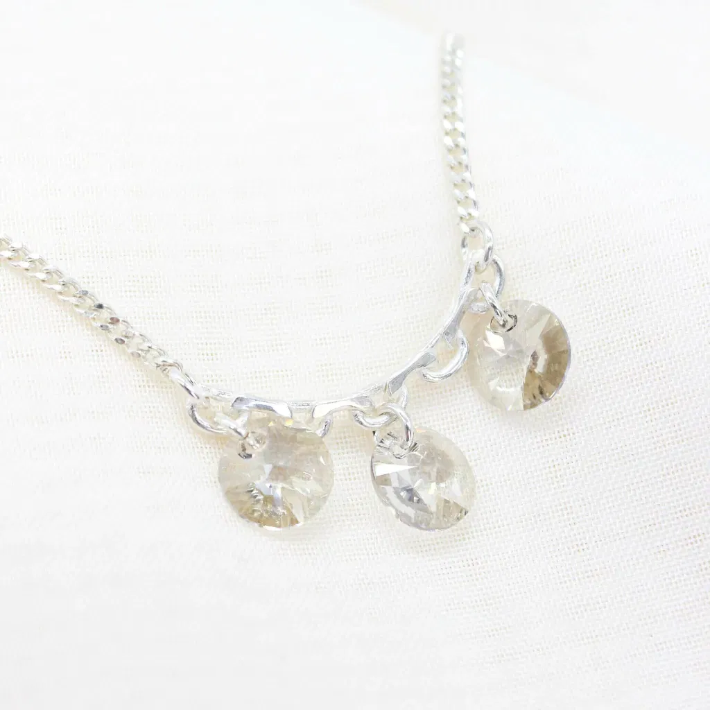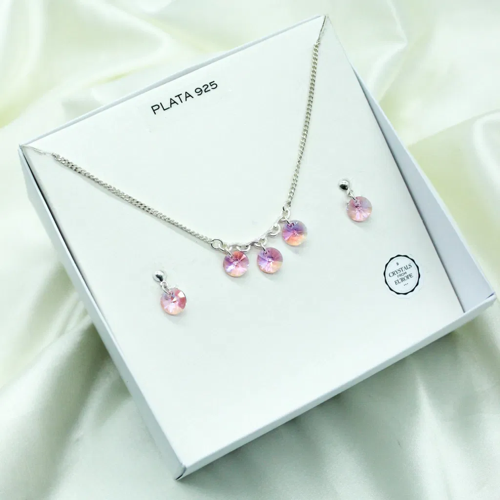 El set incluye un collar de plata 925 con dije redondo de cristal auténtico de Austria (Swarovski) de 10 mm, acompañado de aros a juego que reflejan la luz con cada movimiento.