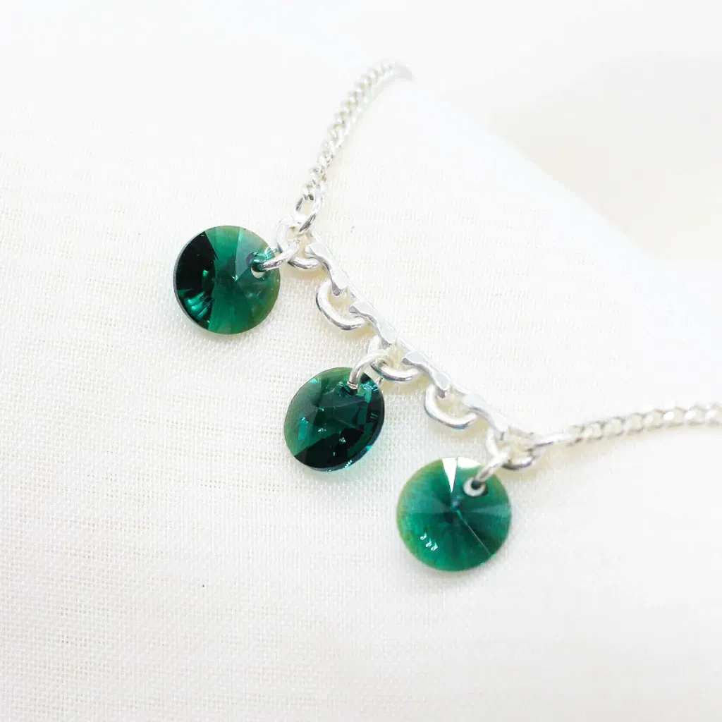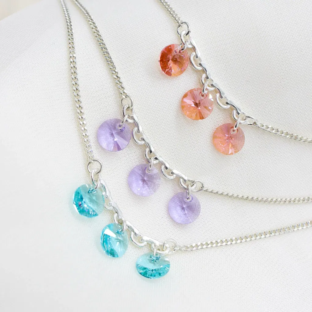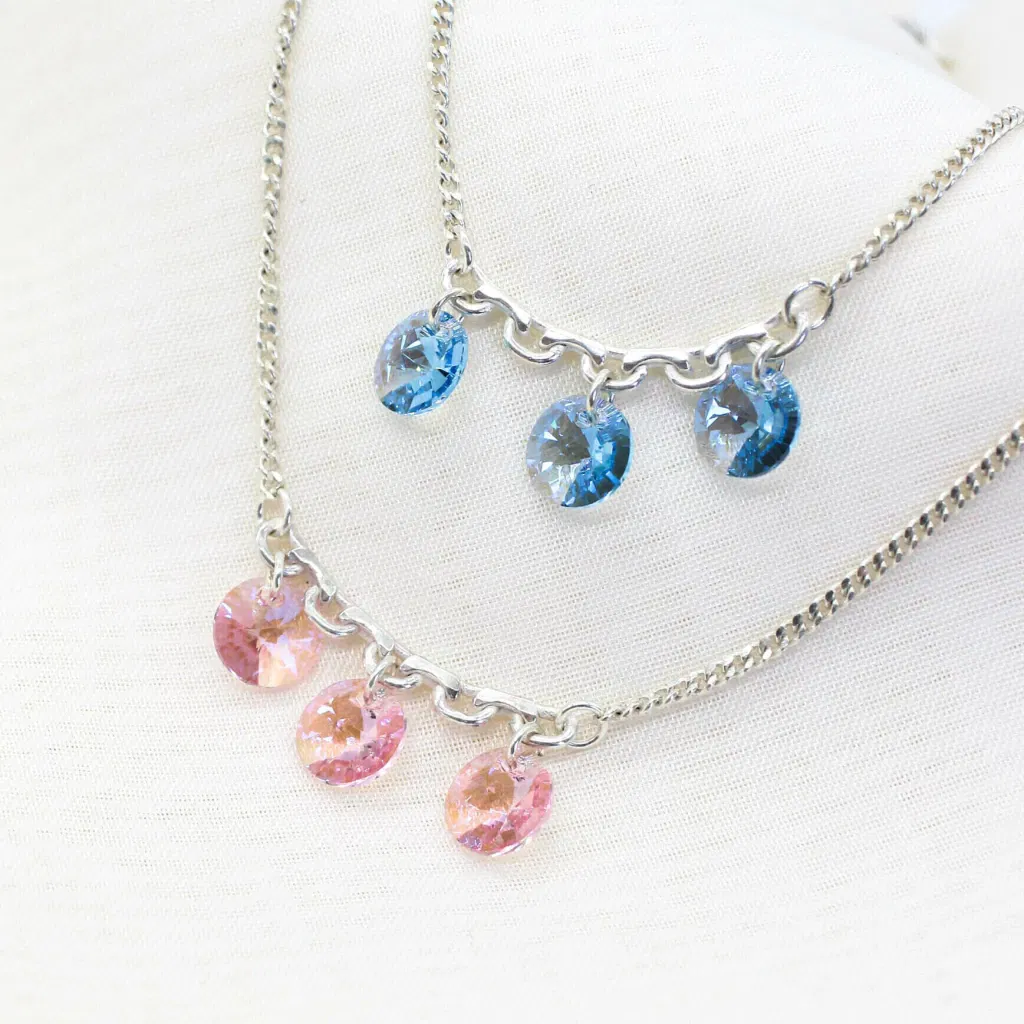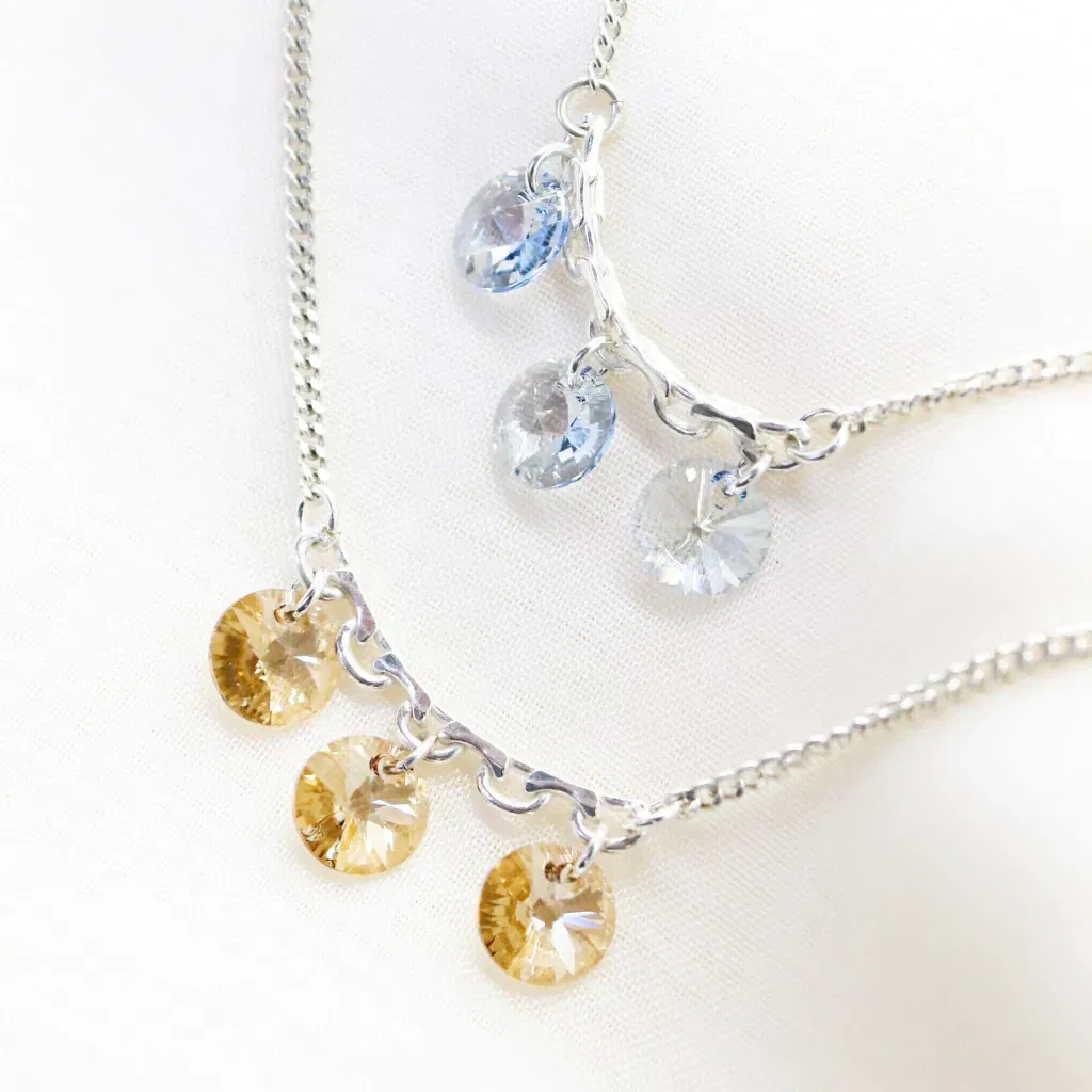 El set incluye un collar de plata 925 con dije redondo de cristal auténtico de Austria (Swarovski) de 10 mm, acompañado de aros a juego que reflejan la luz con cada movimiento.