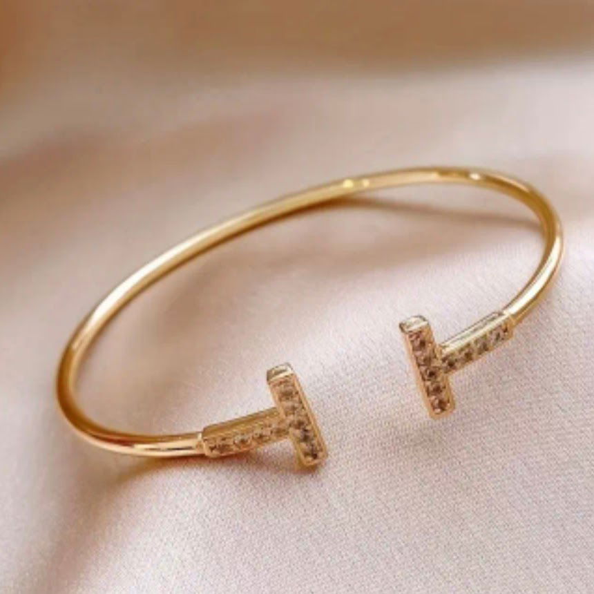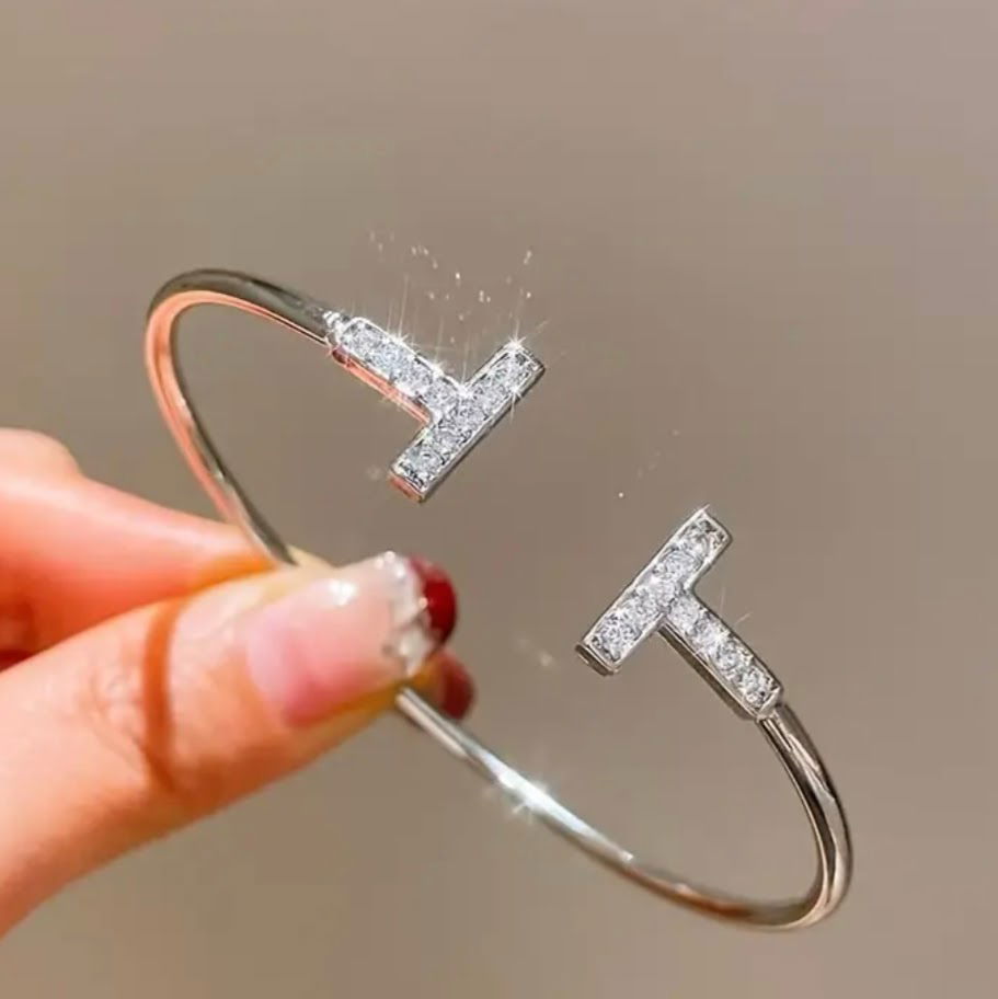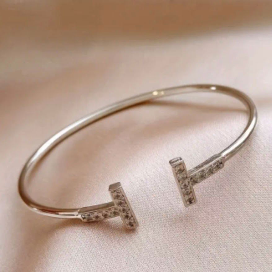Esta pulsera tipo esclava estilo Tiffany combina la nobleza de la plata 925 con un delicado baño de oro, realzada por cristales micropavé que aportan brillo parejo y sofisticado, sin exagerar.