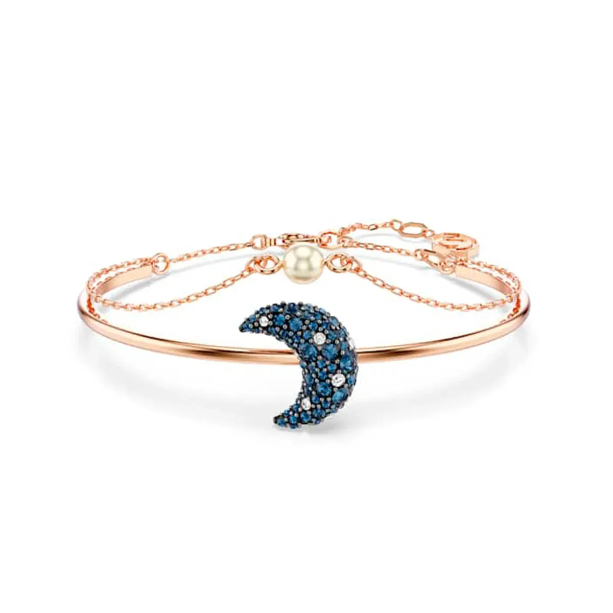 El motivo de media luna central, trabajado con pavé de cristales en tonos oscuros, aporta profundidad visual y un brillo sutil que acompaña cualquier look, de día o de noche.