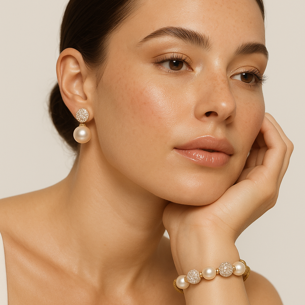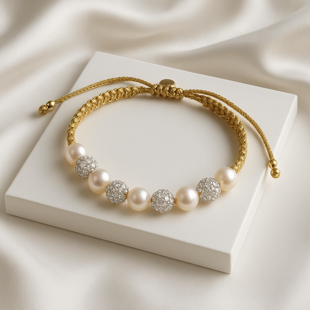 El set de Pulsera y Aros con perlas y detalles en micropavé fue creado para mujeres que buscan destacar con sutileza. Los hilos de plata dorados aportan una caída liviana y sofisticada, mientras que las perlas centrales y el brillo de las zirconias hacen que cada movimiento cuente.