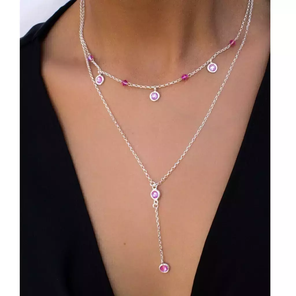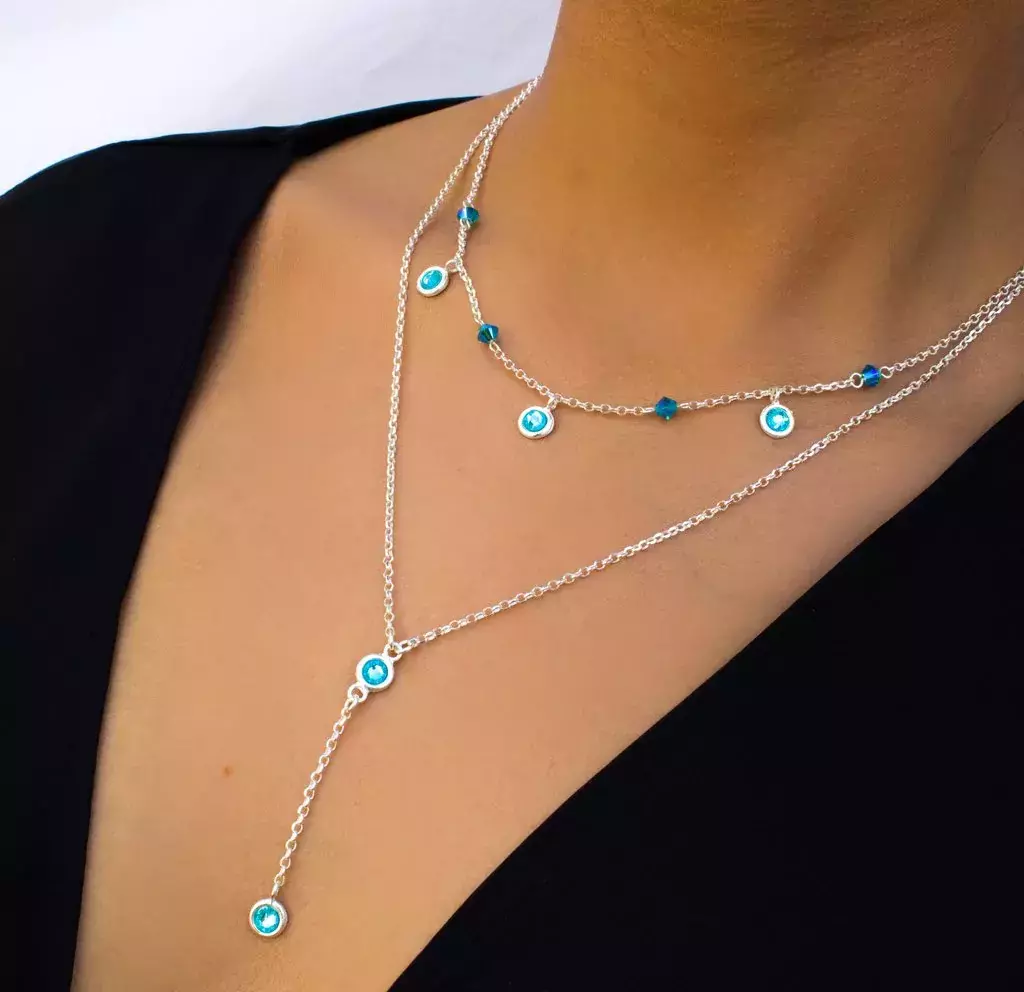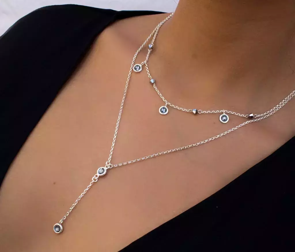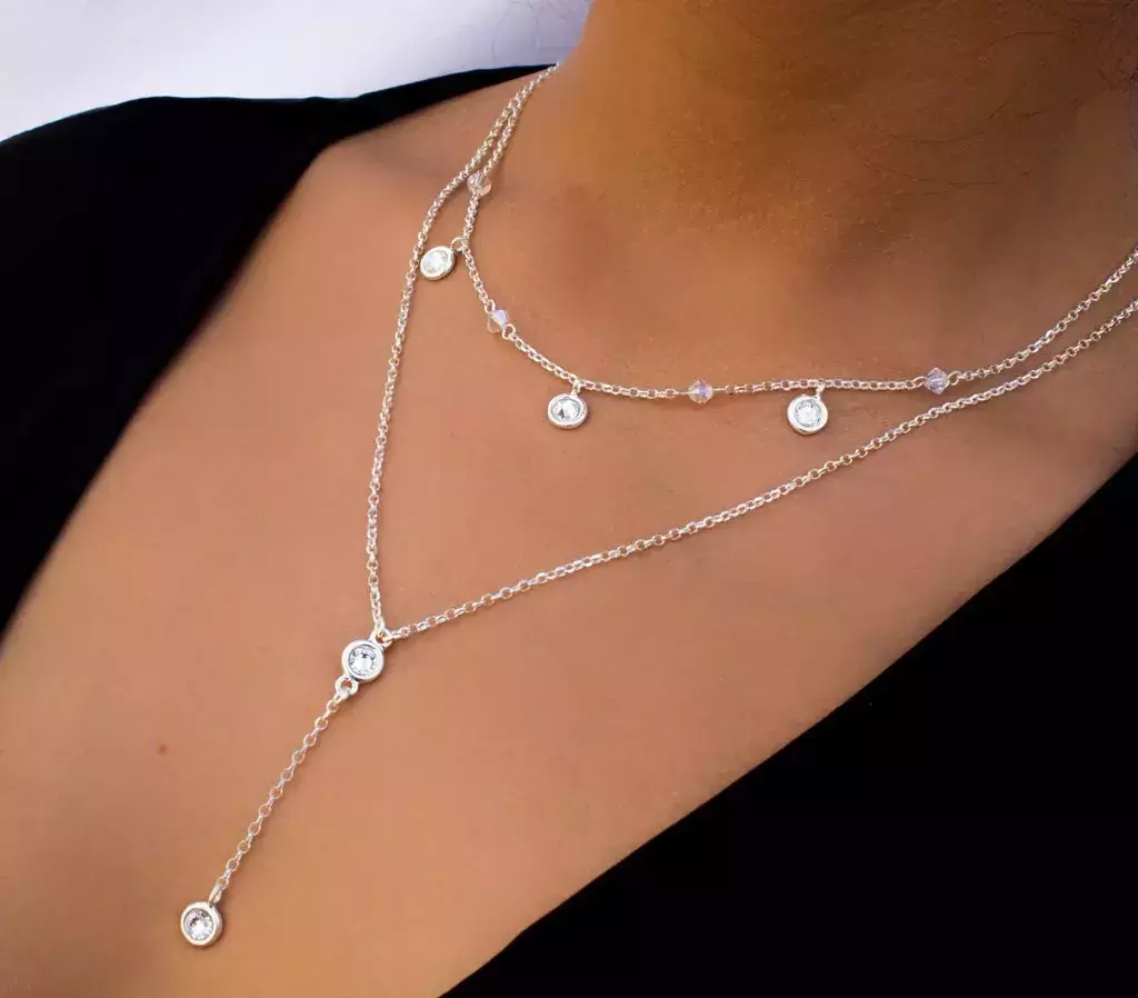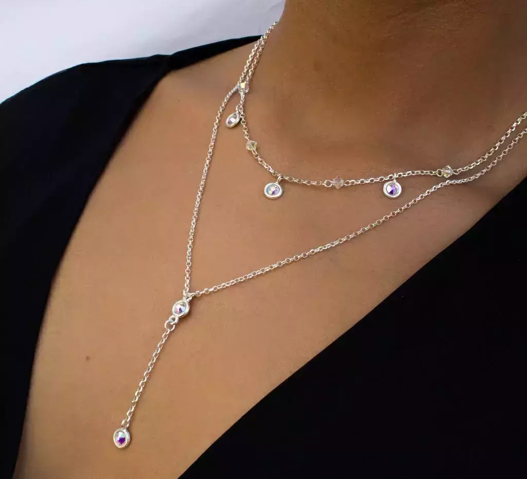 El Collar Lua Doble está confeccionado en Plata 925 de alta pureza y embellecido con Cristales auténticos de Austria® (Swarovski). Su diseño de doble cadena crea un efecto elegante y versátil, pensado para destacar solo o junto a otras piezas Lua. Una joya atemporal, cómoda y liviana para sumar a tu colección o regalar en ocasiones especiales. 💎