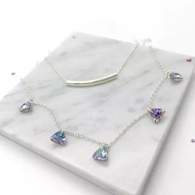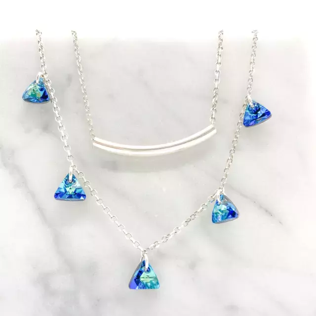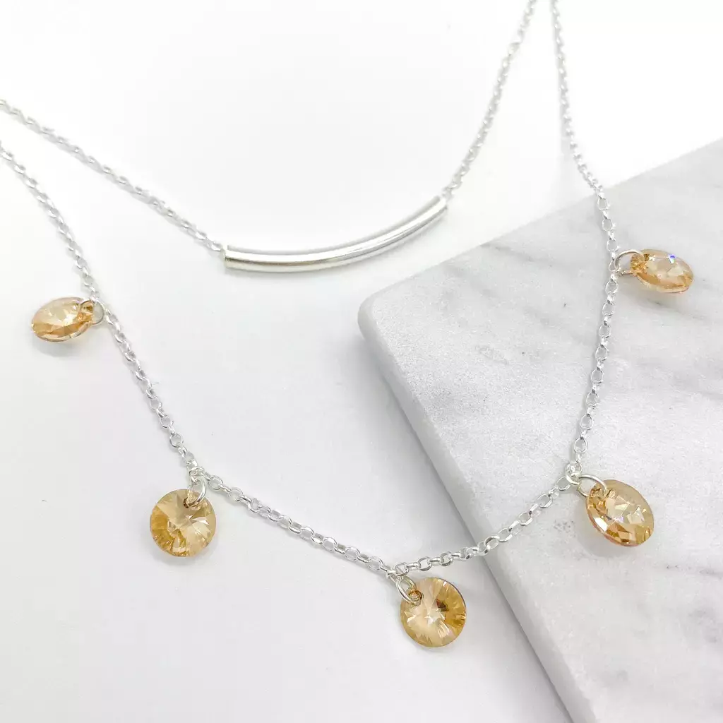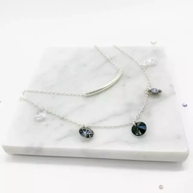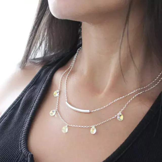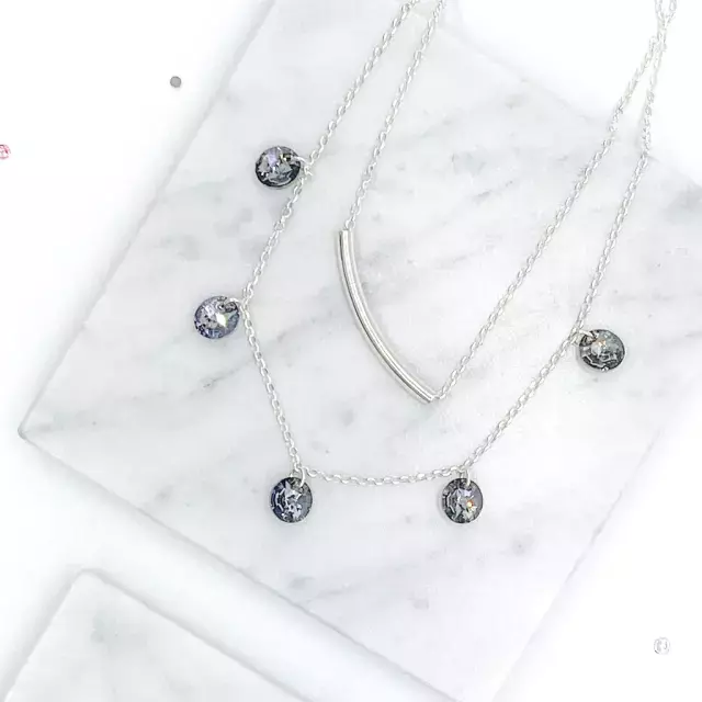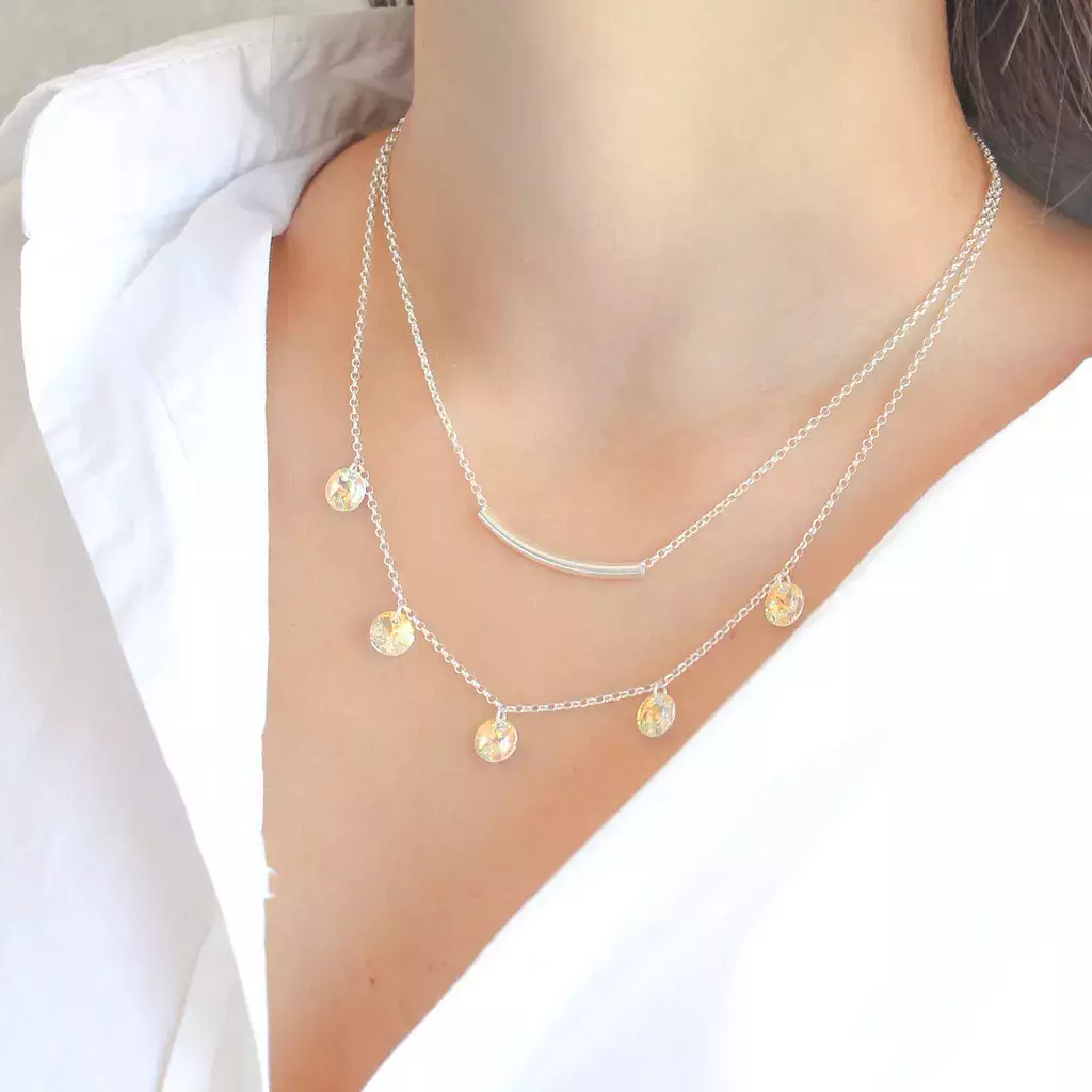 El Collar Doble Lua combina una delicada cadena de Plata 925 italiana con moneditas de Cristal auténtico de Austria® (Swarovski) de 8 mm, creando una pieza luminosa, versátil y fácil de combinar. Su diseño doble —con cadenas de 40 cm y 45 cm— genera un juego de capas elegante que se adapta a looks de día y de noche. 💎