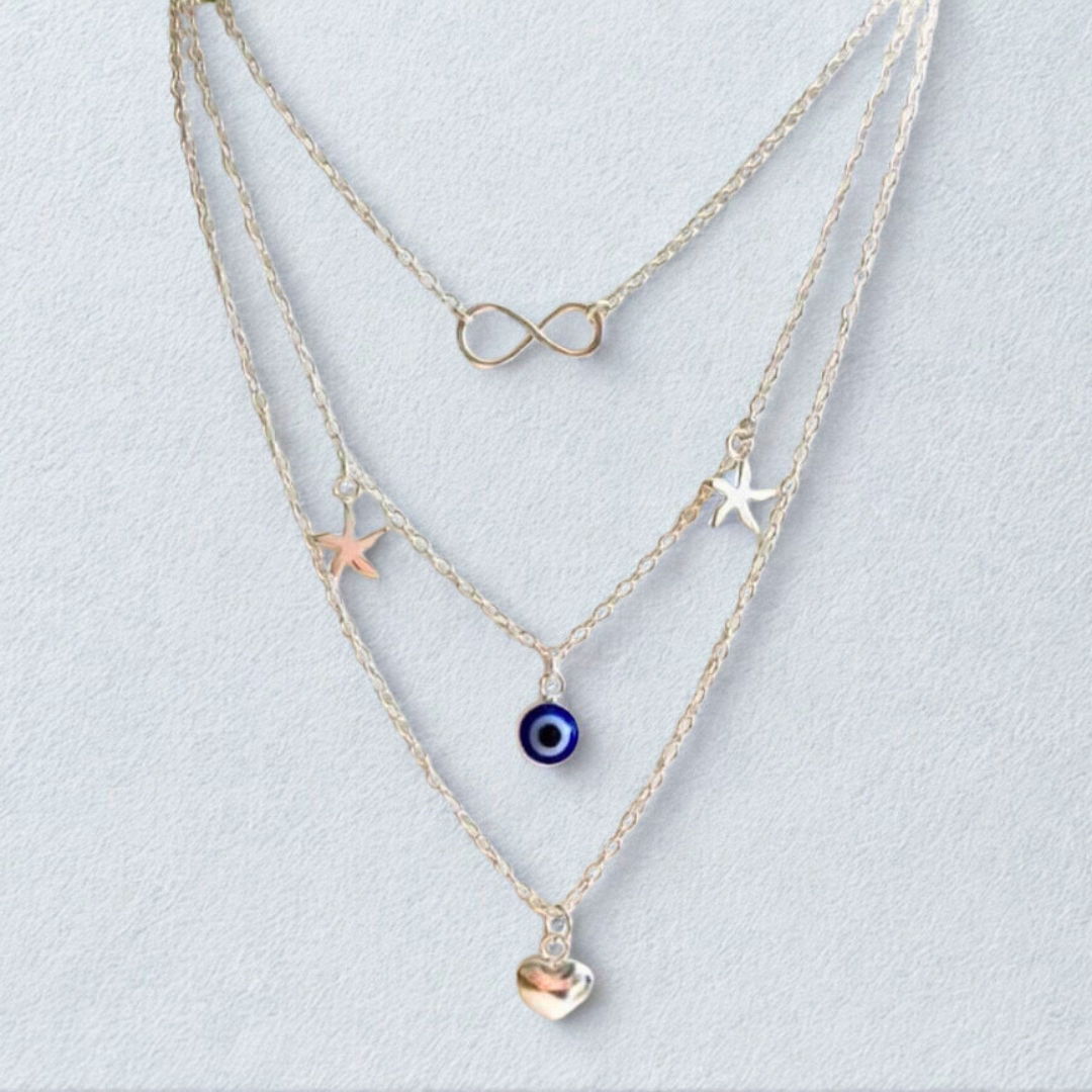 El Collar Triple en Plata 925 combina elegancia, protección y amor eterno en una sola pieza. Incluye tres dijes icónicos: corazón, símbolo infinito y ojo turco, cada uno con un significado profundo que trasciende la moda.
