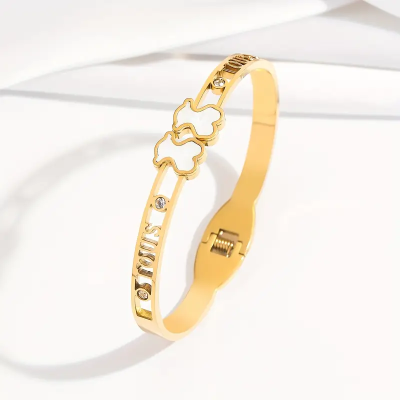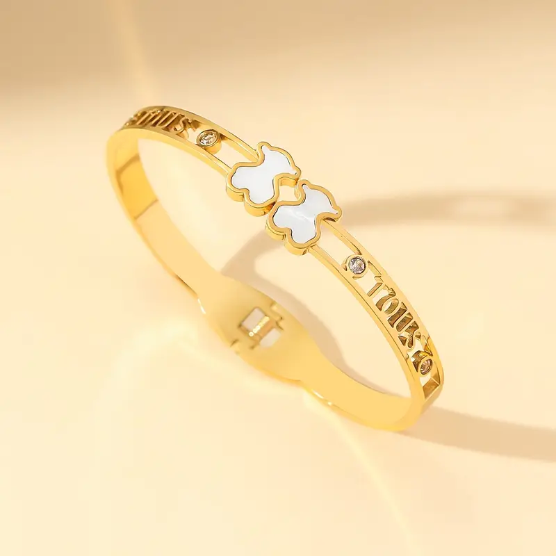La Esclava Real Tous destaca por su estructura bañada en oro de 18 quilates, realzada con dos dijes de oso en nácar y delicados apliques de zirconia que reflejan la luz con elegancia.