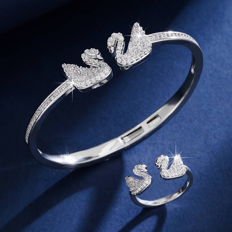El Conjunto Lina reúne anillos y una pulsera inspirados en la silueta del cisne: delicados, modernos y con un brillo que realza cualquier look. La pulsera abierta ajustable se adapta perfecto a la muñeca, mientras que los zircones brillantes le suman ese destello sutil que marca presencia sin exagerar.