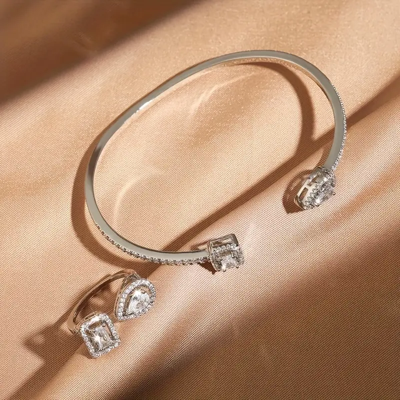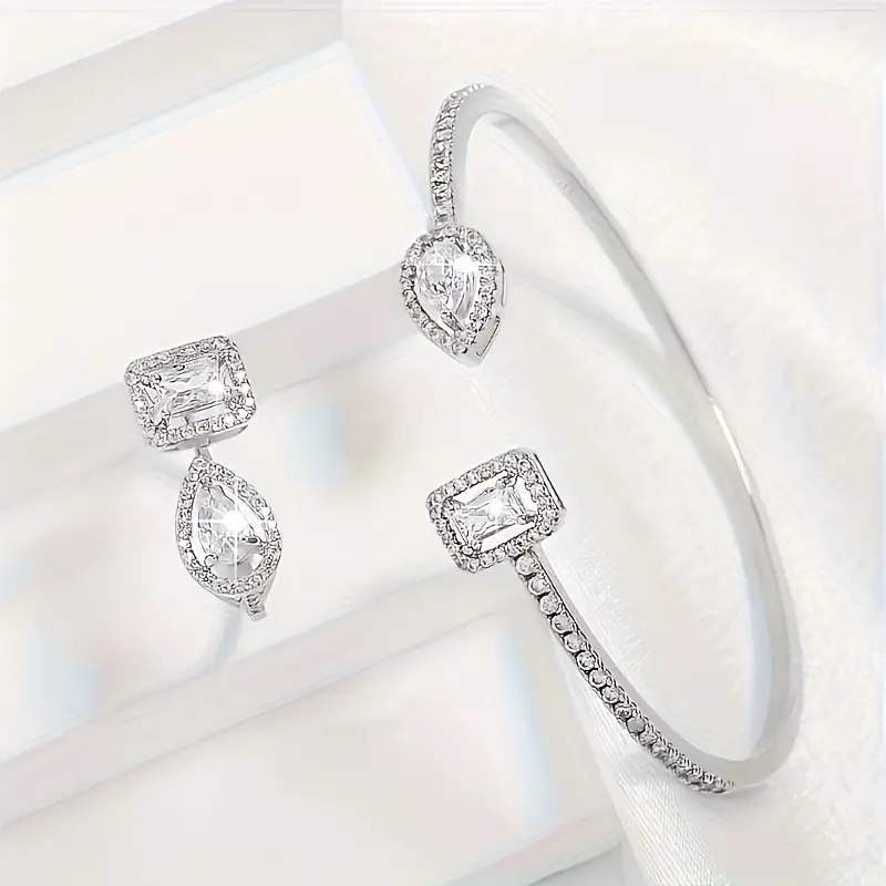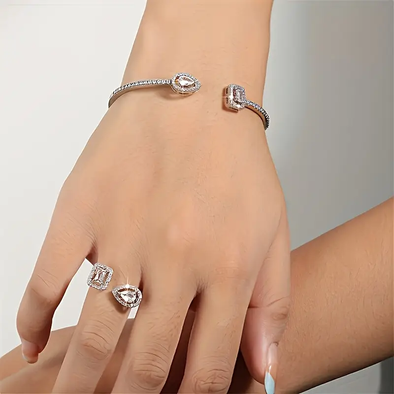 El set Lina combina dos piezas que quedan impecables juntas: un brazalete abierto y un anillo a juego, ambos con zirconita blanca y un diseño moderno de dos bases interconectadas que aporta estilo y luz sin exagerar.