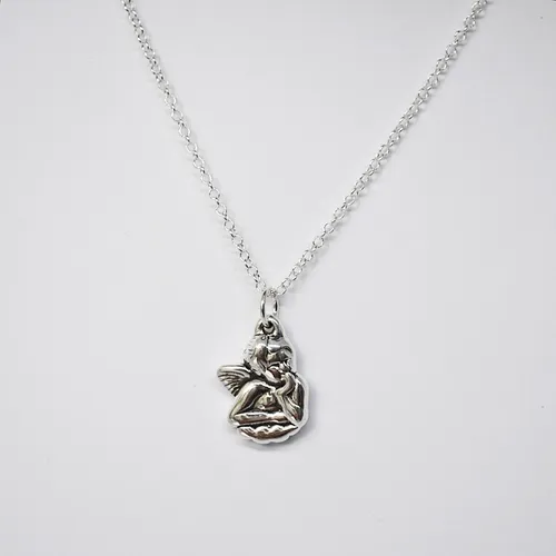 Dije de plata inflada con la imagen del Ángel de la Guarda. Este es un clásico de la joyería, muy buscado para bautismos, comuniones o como amuleto de protección.