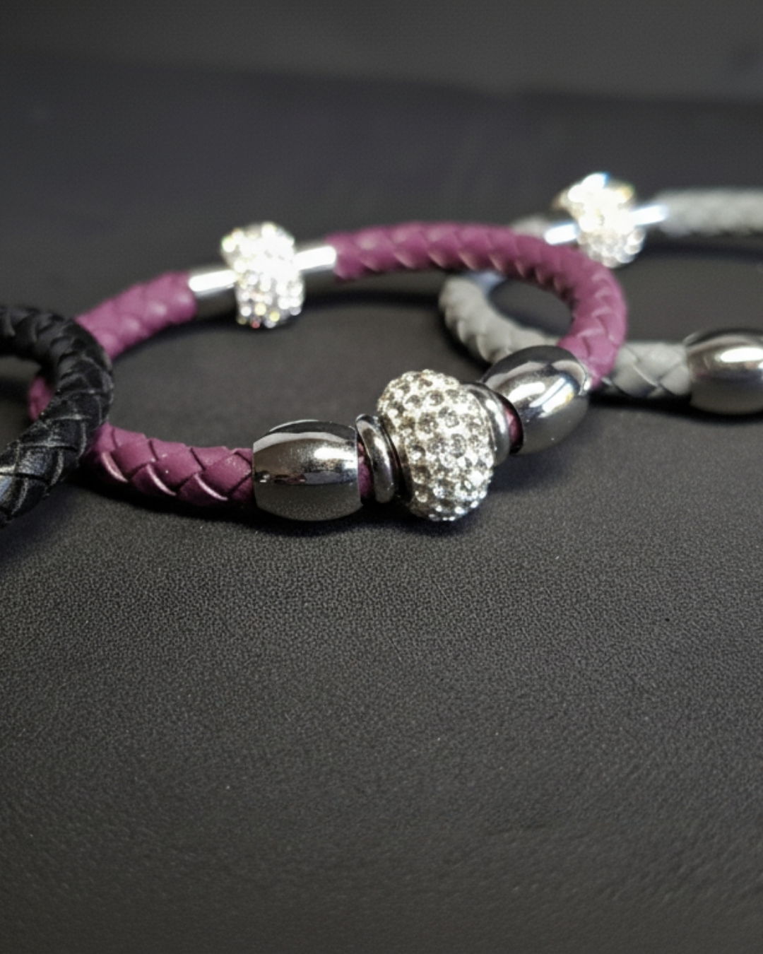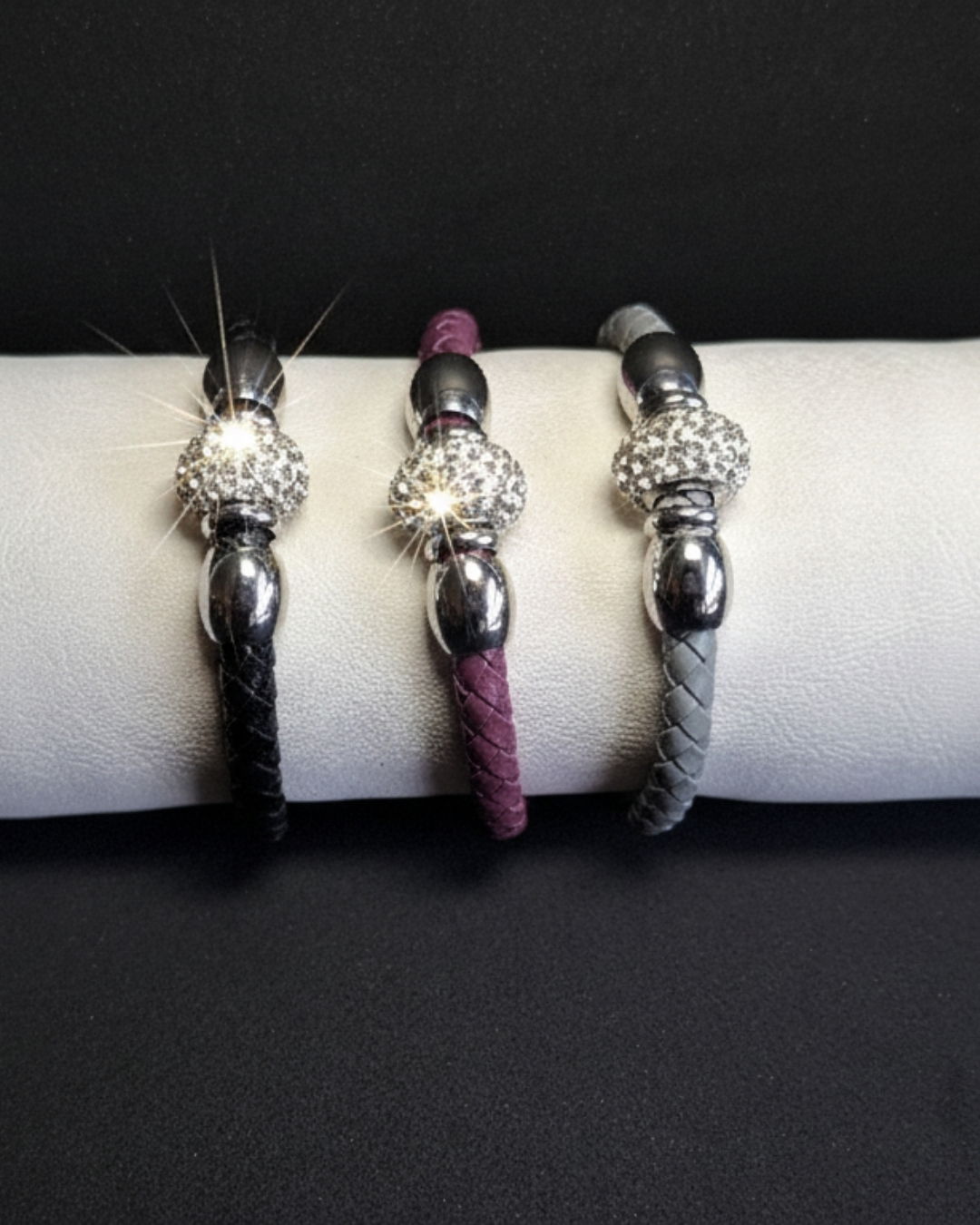 Elegancia y modernidad en una pieza única. Esta pulsera de cuero combina la resistencia del acero italiano con el brillo sutil de un dije con microcristales que aportan distinción a cualquier look. Su cierre magnético asegura practicidad y comodidad, ideal para usar todos los días o en ocasiones especiales.