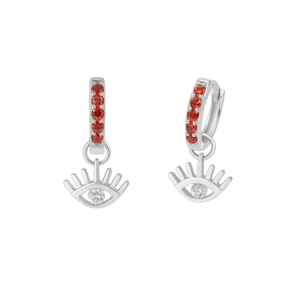 Aros tipo argolla de 12 mm, elaborados en Plata 925, con diseño de Ojo Turco. Incorporan zircones rojos que enmarcan la pieza y un zircon cristal en el centro, aportando brillo definido y contraste visual.