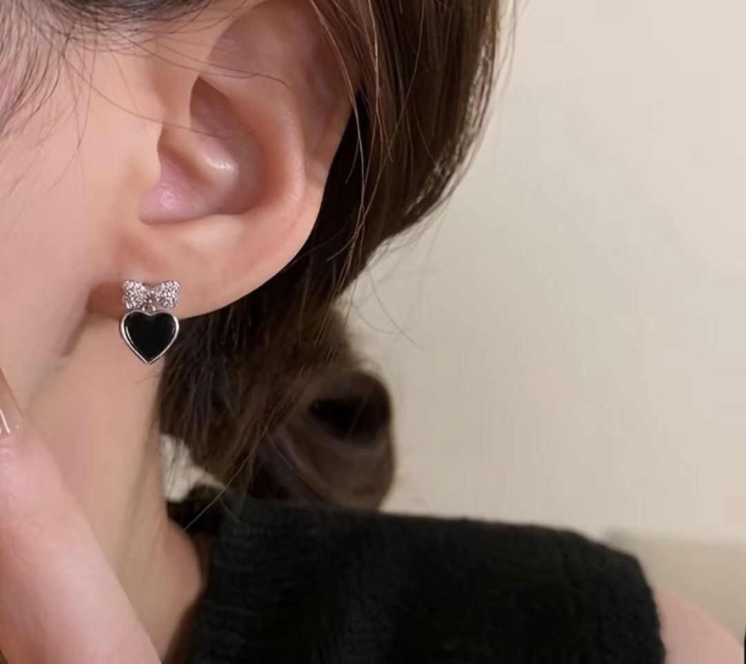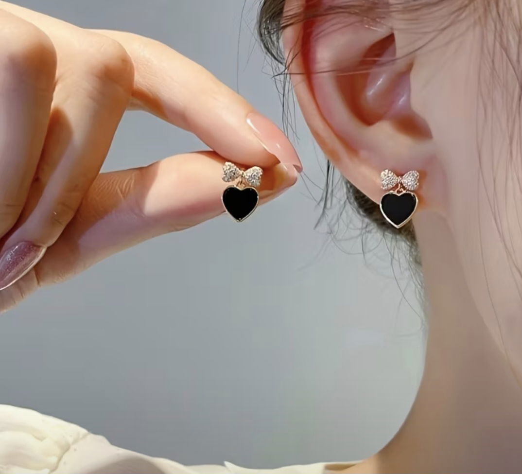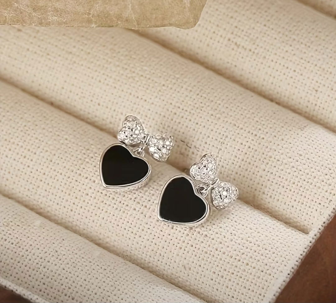 Estos aros colgantes en forma de corazón con piedra ónix destacan por su diseño elegante coronado por un lazo cubierto de zircones, que aporta luz y sofisticación a cada movimiento.