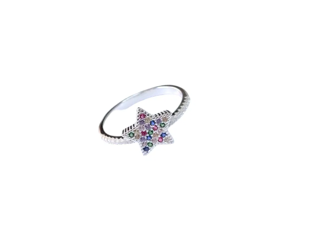 El Anillo Lua de Plata 925 captura toda la magia de una estrella adornada con zircones multicolor. Con un peso liviano de apenas 2 gramos, esta joya combina elegancia, alegría y sofisticación en una pieza perfecta para acompañarte todos los días. 💎