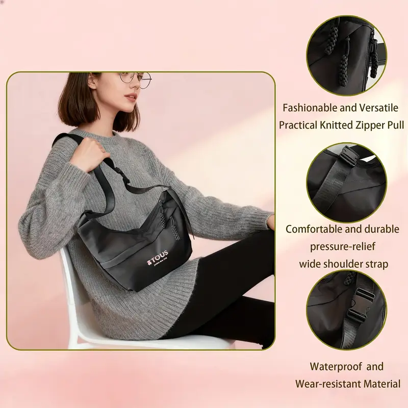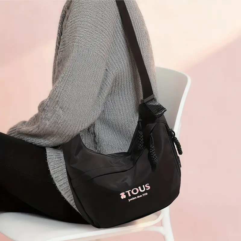 Bolso bandolera inspirado en el estilo TOUS, confeccionado en tela Oxford resistente, con acabado negro y emblema dorado que aporta un toque clásico y moderno a la vez.