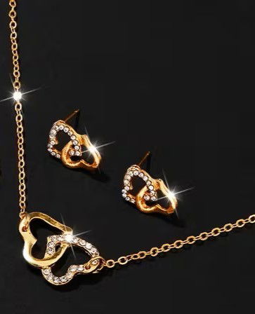 Un set que queda fino y muy prolijo: collar + aros en tono Rose, con doble corazón entrelazado y cristales micropavé que dan ese brillo parejo y elegante (sin caer en lo exagerado). Ideal para usar a diario cuando querés verte “arreglada” sin esfuerzo, o para regalo cuando querés quedar bien.