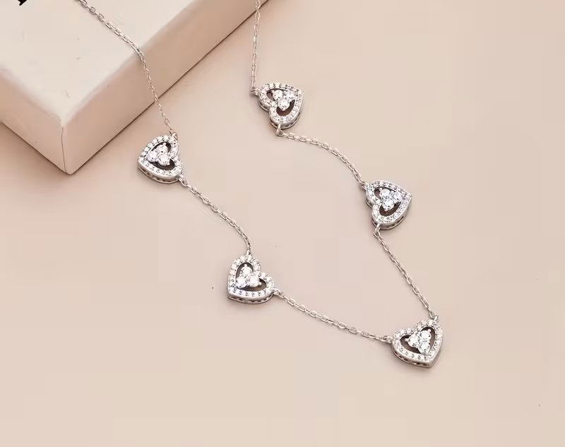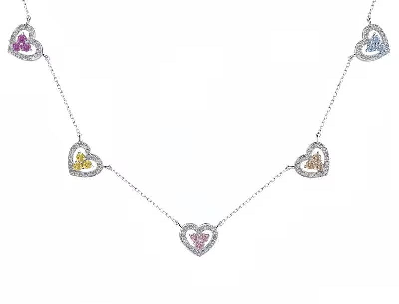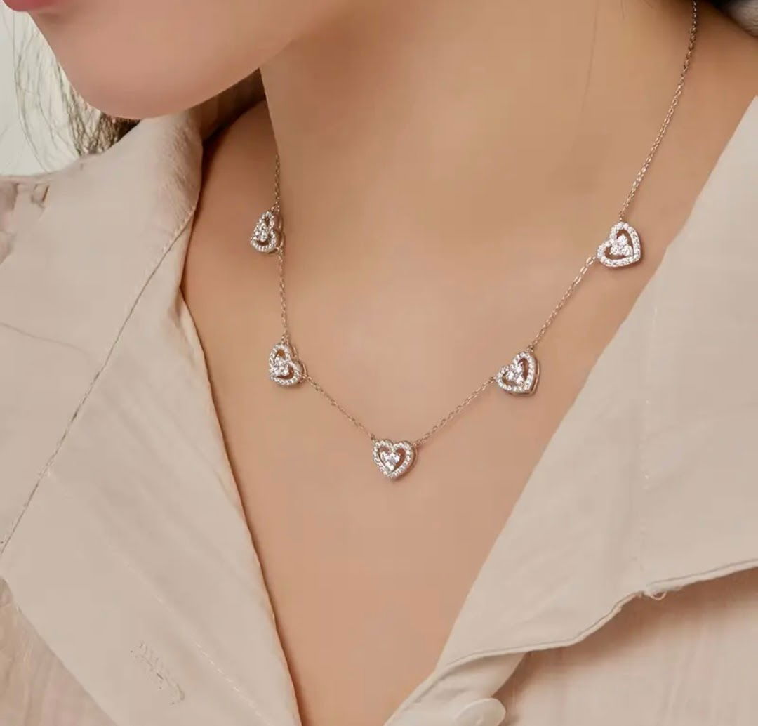 Collar elaborado en Plata 925 que combina un delicado micropavé con cinco corazones en tonos Arco Iris, cada uno engarzado con zircones que capturan la luz de manera intensa y uniforme. Es una pieza moderna, femenina y con mucha personalidad, pensada para quienes buscan una joya adaptable y llamativa sin perder elegancia.