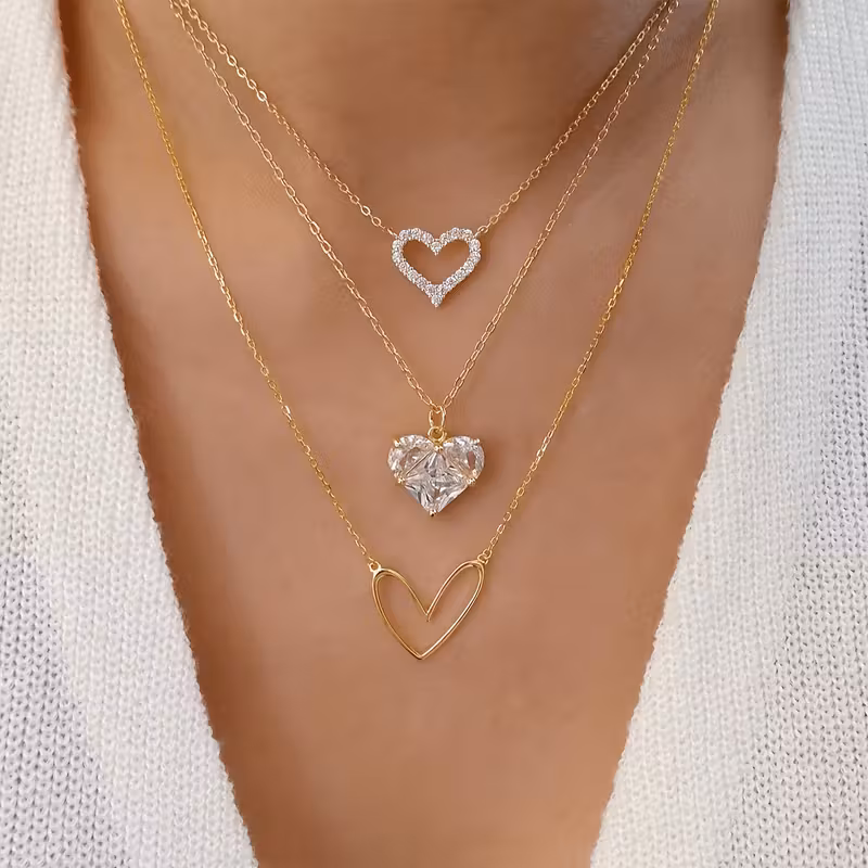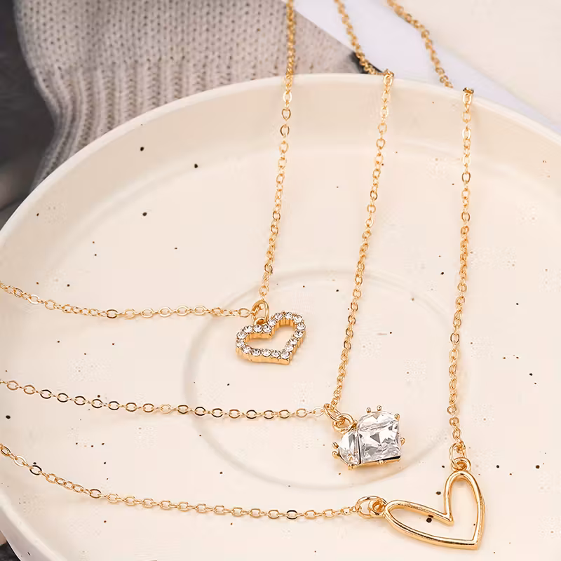Set de collar triple con corazones en acabado dorado. Tres largos distintos pensados para usar juntos o por separado. Tendencia layering con estética retro y terminación elegante.
