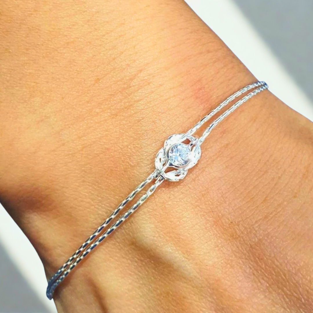 La Pulsera Doble en Plata 925 de la Colección Lua Zirconia combina un diseño elegante con un simbolismo profundo. Su nudo entrelazado evoca la forma del infinito, mientras que el zircon central aporta un destello sutil que eleva tu estilo con naturalidad.