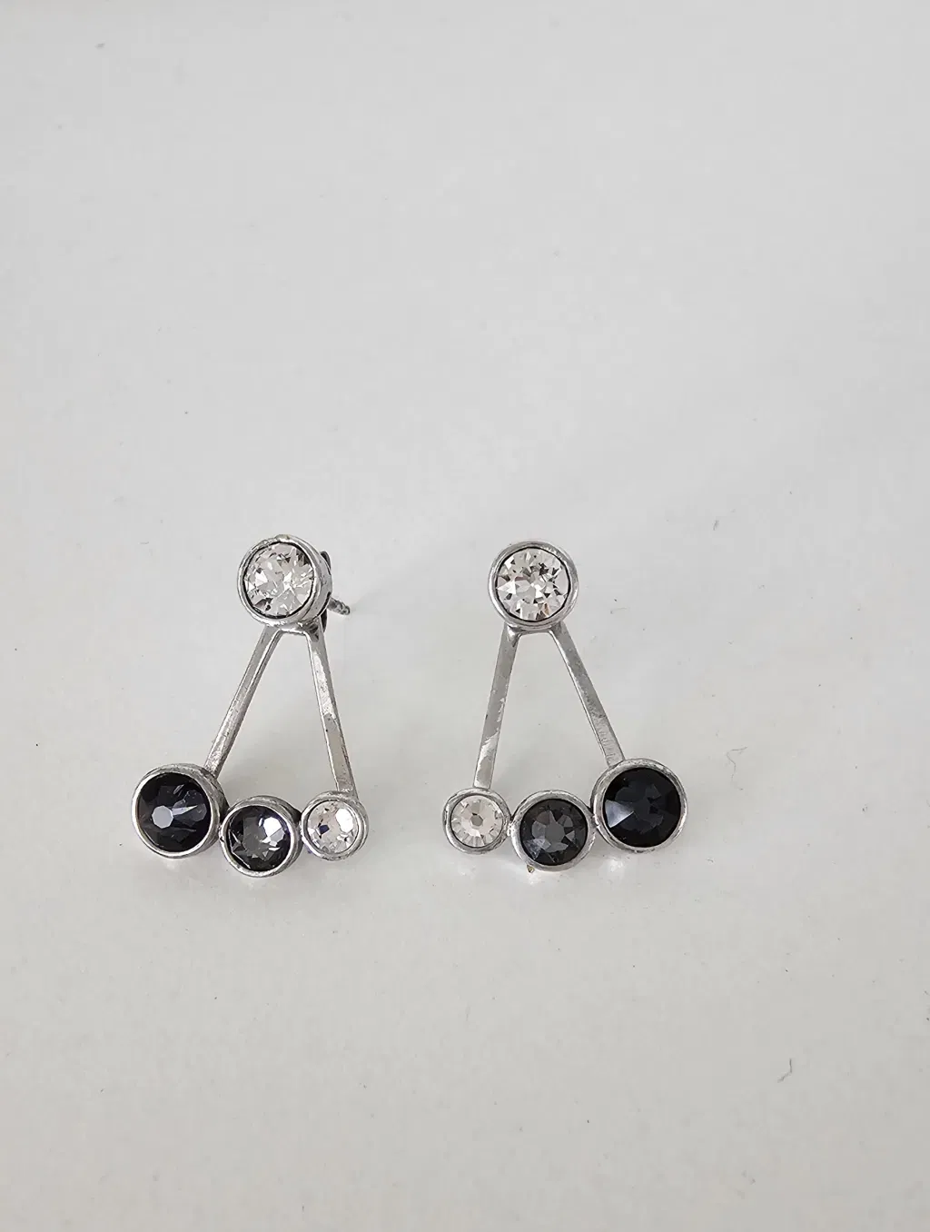 Los Aros Lua están confeccionados en Plata 925 rodinada, decorados con cristales redondos de 0,5 mm de Cristales auténticos de Austria® (Swarovski) en un elegante degradé gris. Su diseño innovador permite usarlos de dos formas: completos para un look impactante o solo con el cristal superior para un estilo más minimalista. 💎