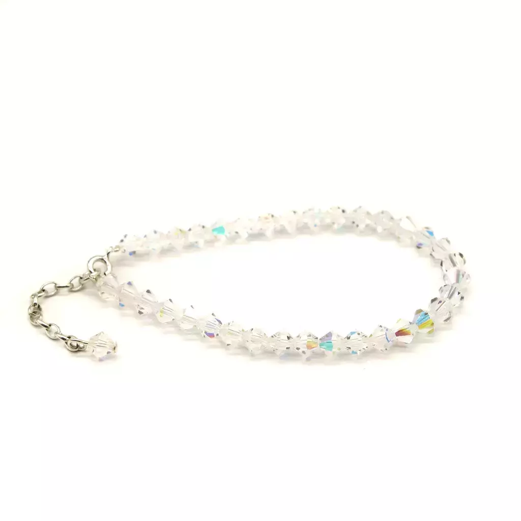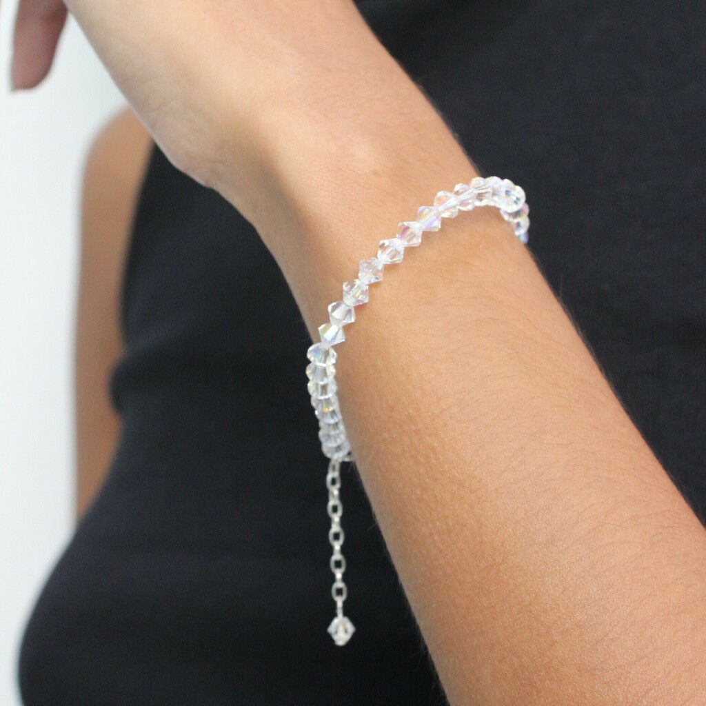 Confeccionada con cristales checos Preciosa® de 5 mm y terminaciones en Plata 925, esta pulsera equilibra elegancia y comodidad en una pieza versátil que podés usar todos los días.