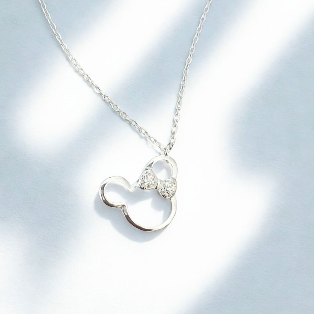 Reviví la magia con este collar en Plata 925 rodinada, protagonizado por un dije de Minnie Disney con cristales micropavé que deslumbran con cada movimiento.
