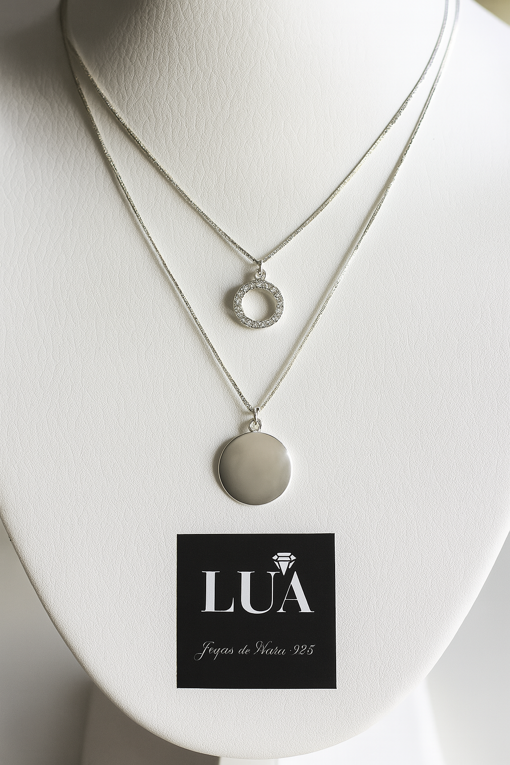 Nuestro Collar Doble Lua en Plata 925 rodinada combina dos cadenas en perfecta armonía: una adornada con un dije circular de zircones y otra con un círculo liso en Plata 925.