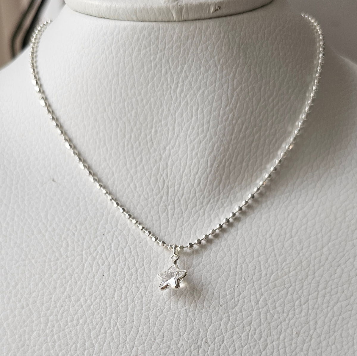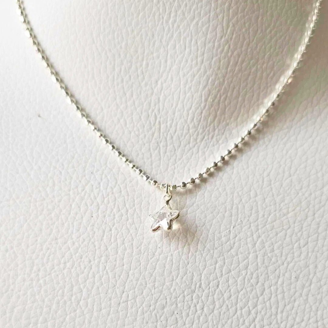 Este collar realizado en plata 925 combina una cadena de bolitas delicadas con un dije en forma de estrella con zirconia, logrando un equilibrio perfecto entre sutileza y brillo.