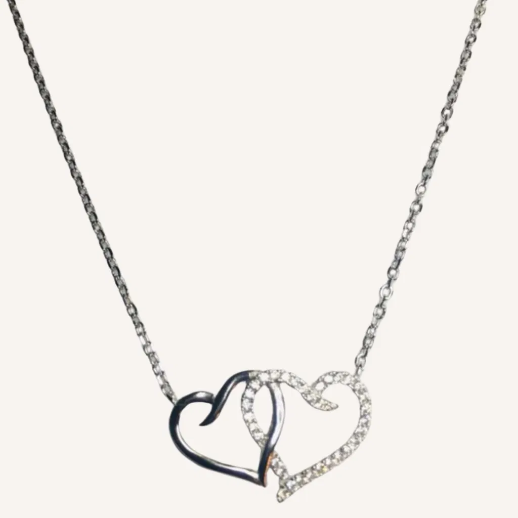 Un doble corazón que enamora 💖. Este collar de la Colección Zirconia está hecho en plata 925 con baño de rodio y presenta un dije de dos corazones adornado con cristales zirconia cúbica blancos, que reflejan la luz con cada movimiento.
