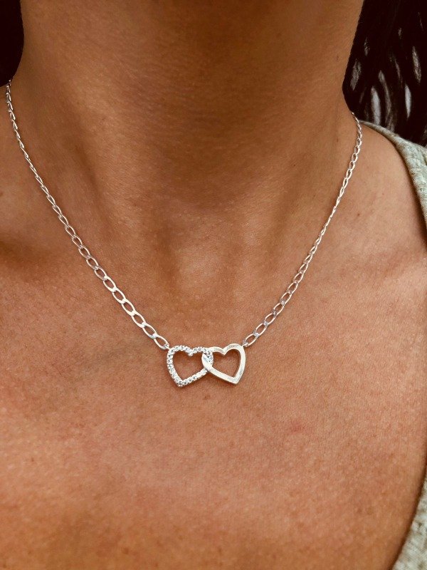 Un diseño sutil y elegante: cadena en Plata 925 con doble dije de corazón, uno liso y otro con micropavé de zircones que suma brillo delicado sin perder la simpleza. Ideal para usar todos los días o combinar en capas. ✨